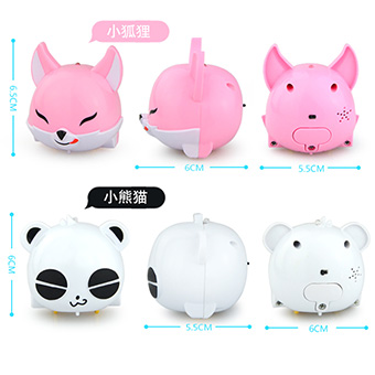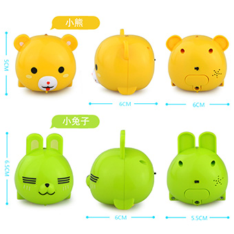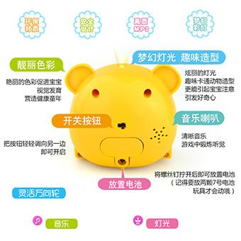 玩具走路的样子一摇一摆的,方向也不规律,动起来的样子非常可爱,头顶上炫丽的灯光不停的转换灯光颜色,音乐伴随着灯光。